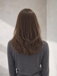 髪に優しいケアカラーを使用することで、髪への負担を最小限に抑えながらツヤのある色合いに染めていきます。
